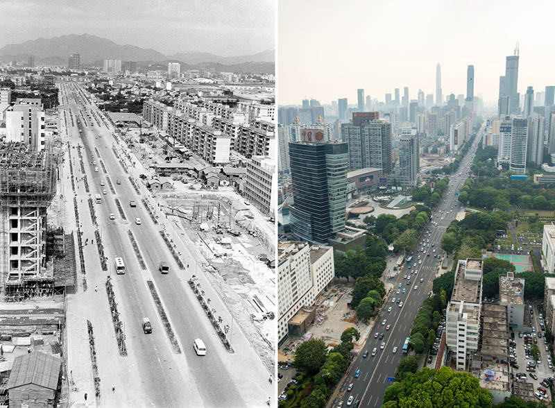 La parte superior (archivo) es una foto tomada por Li Changyong que muestra la calle Shennan de Shenzhen, provincia de Guangdong. La foto inferior tomada por Mao Siqian presenta la misma calle, pero el 23 de mayo del 2018. Este a?o se conmemora el 40 aniversario de la política de reforma y apertura de China. En las últimas cuatro décadas, Shenzhen se ha desarrollado desde su condición de peque?o puerto pesquero hasta convertirse en una metrópolis global. (Foto: Xinhua)