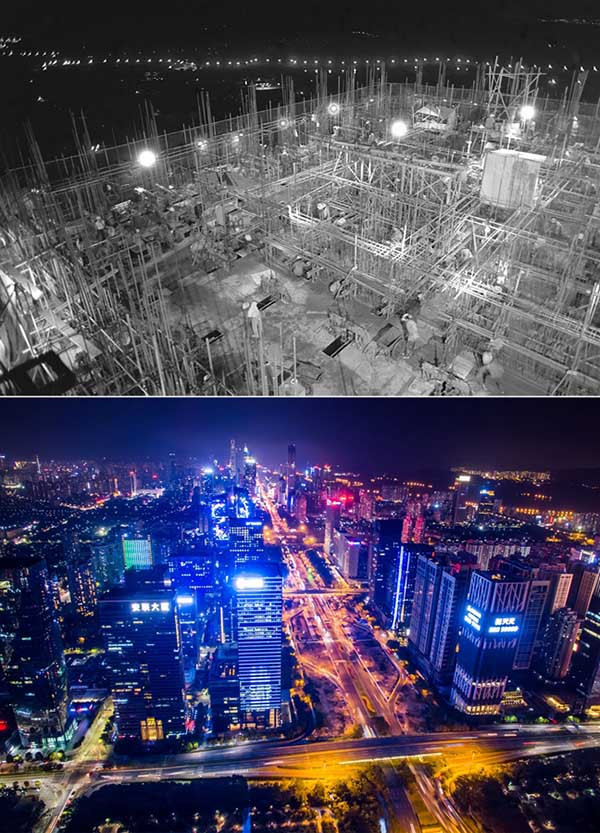 La parte superior (archivo) es una foto tomada por Chen Xuesi muestra el sitio de construcción de un centro para el comercio internacional en Shenzhen, provincia de Guangdong. La foto inferior tomada por Mao Siqian el 14 de febrero del 2017 muestra una vista nocturna de Shenzhen. Este a?o se conmemora el 40 aniversario de la política de reforma y apertura de China. En las últimas cuatro décadas, Shenzhen se ha desarrollado desde su condición de peque?o puerto pesquero hasta convertirse en una metrópolis global. (Foto: Xinhua)