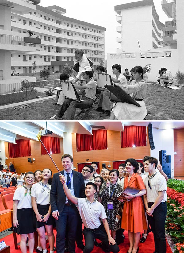 La parte superior (archivo) es una foto tomada por Pan Jiamin que muestra a los estudiantes de la Universidad de Shenzhen de la facultad de arte arquitectónico. La foto inferior tomada por Mao Siqian el 13 de septiembre del 2017 muestra a los estudiantes de la Universidad MSU-BIT de Shenzhen posando para un selfie después de una ceremonia de apertura en el inicio de semestre en Shenzhen. Este a?o se conmemora el 40 aniversario de la política de reforma y apertura de China. En las últimas cuatro décadas, Shenzhen se ha desarrollado desde su condición de peque?o puerto pesquero hasta convertirse en una metrópolis global. (Foto: Xinhua)