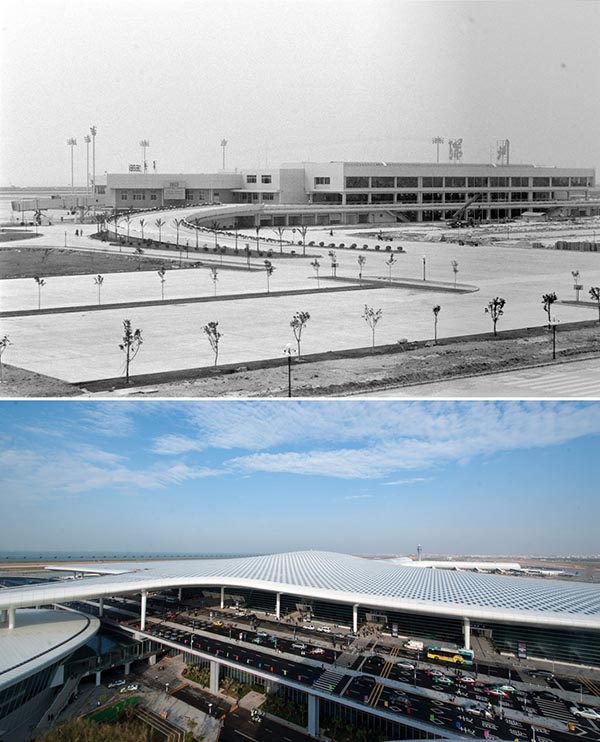 La parte superior (archivo) es una foto tomada por Pan Jiamin que muestra una antigua terminal del aeropuerto de Shenzhen, provincia de Guangdong. La foto inferior tomada por Mao Siqian el 28 de noviembre del 2013 muestra una nueva terminal del aeropuerto en Shenzhen. Este a?o se conmemora el 40 aniversario de la política de reforma y apertura de China. En las últimas cuatro décadas, Shenzhen se ha desarrollado desde su condición de peque?o puerto pesquero hasta convertirse en una metrópolis global. (Foto: Xinhua)