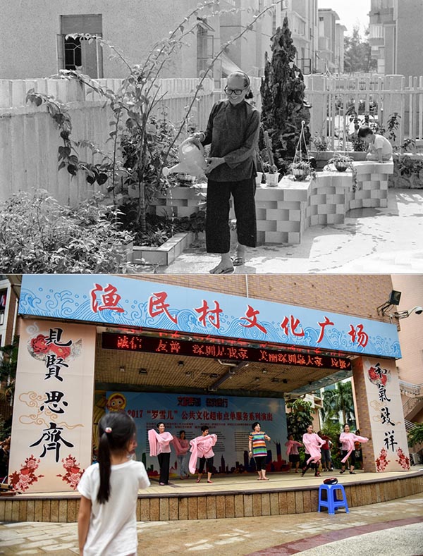 La parte superior (archivo) es una foto tomada por Pan Jiamin muestra a un residente regando flores en Yumin, Shenzhen, provincia de Guangdong. La foto inferior tomada por Mao Siqian el 7 de septiembre de 2017 muestra a los residentes bailando en una plaza de cultura comunitaria de Yumin. Este a?o se conmemora el 40 aniversario de la política de reforma y apertura de China. En las últimas cuatro décadas, Shenzhen se ha desarrollado desde su condición de peque?o puerto pesquero hasta convertirse en una metrópolis global. (Foto: Xinhua)