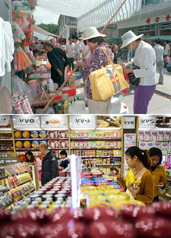 La parte superior (archivo) es una foto tomada por Yang Shaoming que muestra una calle comercial en Shenzhen, provincia de Guangdong. La foto inferior tomada por Mao Siqian el 7 de diciembre del 2015 muestra el centro comercial CTFHOKO en Shenzhen. Este a?o se conmemora el 40 aniversario de la política de reforma y apertura de China. En las últimas cuatro décadas, Shenzhen se ha desarrollado desde su condición de peque?o puerto pesquero hasta convertirse en una metrópolis global. (Foto: Xinhua)