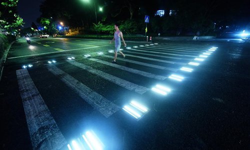 Un hombre camina sobre el paso peatonal iluminado en la calle Xixi de Hangzhou, capital de la provincia de Zhejiang, este de China, el 2 de julio de 2018. Las luces instaladas a lo largo del paso de peatones se iluminan por la noche, dando instrucciones a los peatones y vehículos. Foto: Xinhua