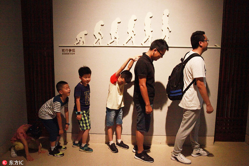 Padres e hijos simulan el proceso de evolución en un Museo de Nanjing, provincia de Jiangsu, 1ro de julio del 2018. [Foto: IC]