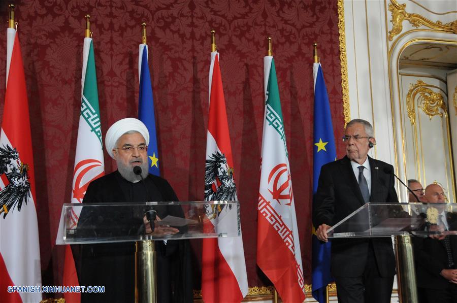 El presidente de Austria, Alexander Van der Bellen (d) y su homólogo de Irán, Hassan Rouhani (i) participan en una conferencia de prensa en Viena, Austria, el 4 de julio de 2018. (Xinhua/Liu Xang)