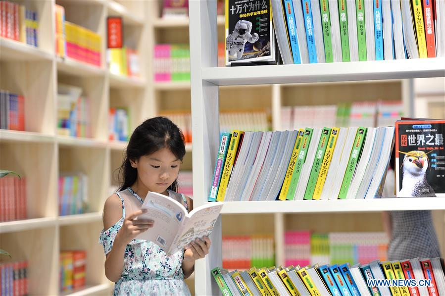 Wuhan, 06/07/2018(El Pueblo en Línea) -Una ni?a lee un libro en la Librería Xinhua en el condado Baokang de la provincia central de Hubei, el 4 de julio de 2018. Los ni?os participan en diversas actividades durante las vacaciones de verano. (Xinhua / Yang Tao)