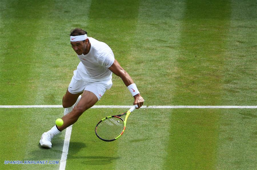LONDRES, julio 5, 2018 (Xinhua) -- Rafael Nadal, de Espa?a, devuelve la pelota a Mikhail Kukushkin, de Kazajistán, durante el partido individual varonil de segunda ronda del Campeonato de Wimbledon 2018, en Londres, Reino Unido, el 5 de julio de 2018. Rafael Nadal ganó el encuentro. (Xinhua/Guo Qiuda)