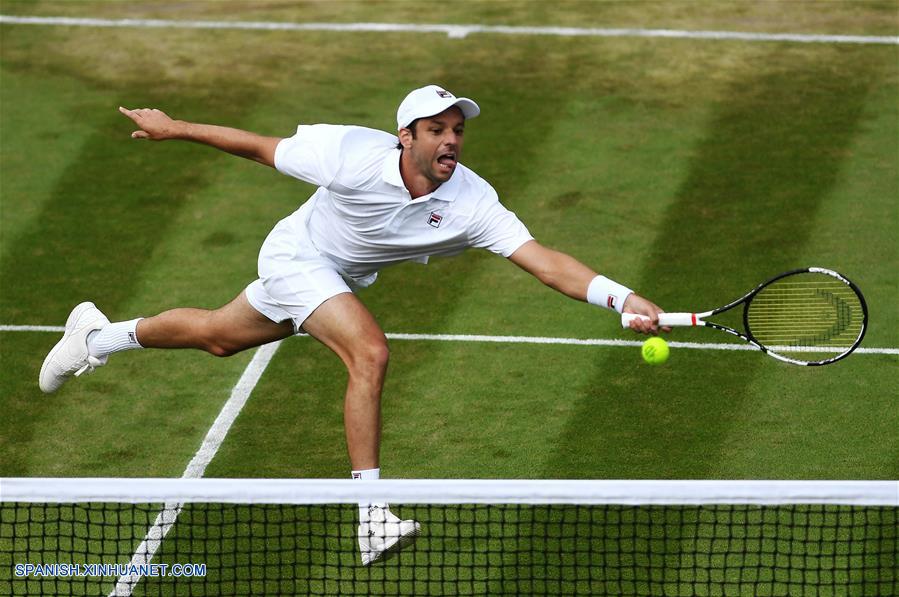 LONDRES, julio 5, 2018 (Xinhua) -- Horacio Zeballos, de Argentina, devuelve la pelota a Novak Dokovic, de Serbia, durante el partido individual varonil de segunda ronda del Campeonato de Wimbledon 2018, en Londres, Reino Unido, el 5 de julio de 2018. Novak Dokovic ganó el encuentro. (Xinhua/Guo Qiuda)