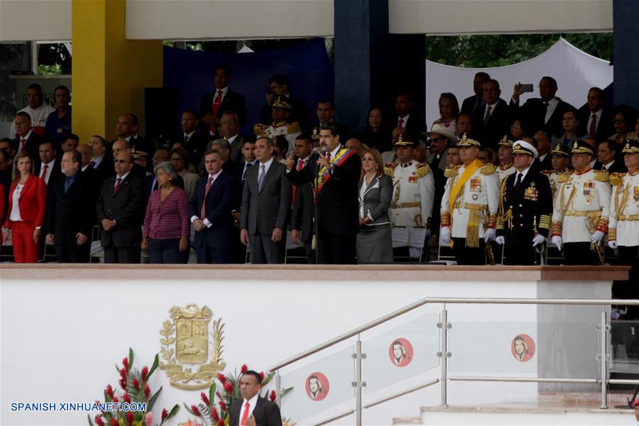 CARACAS, julio 5, 2018 (Xinhua) -- El presidente venezolano, Nicolás Maduro (c-frente), pronuncia un discurso durante un desfile cívico-militar en conmemoración del 207 aniversario de la firma del Acta de Declaración de Independencia, en el Paseo Monumental Los Próceres, en Caracas, Venezuela, el 5 de julio de 2018. Venezuela celebra el jueves la conmemoración por el 207 aniversario de la firma del Acta de Declaración de Independencia. (Xinhua/Boris Vergara)