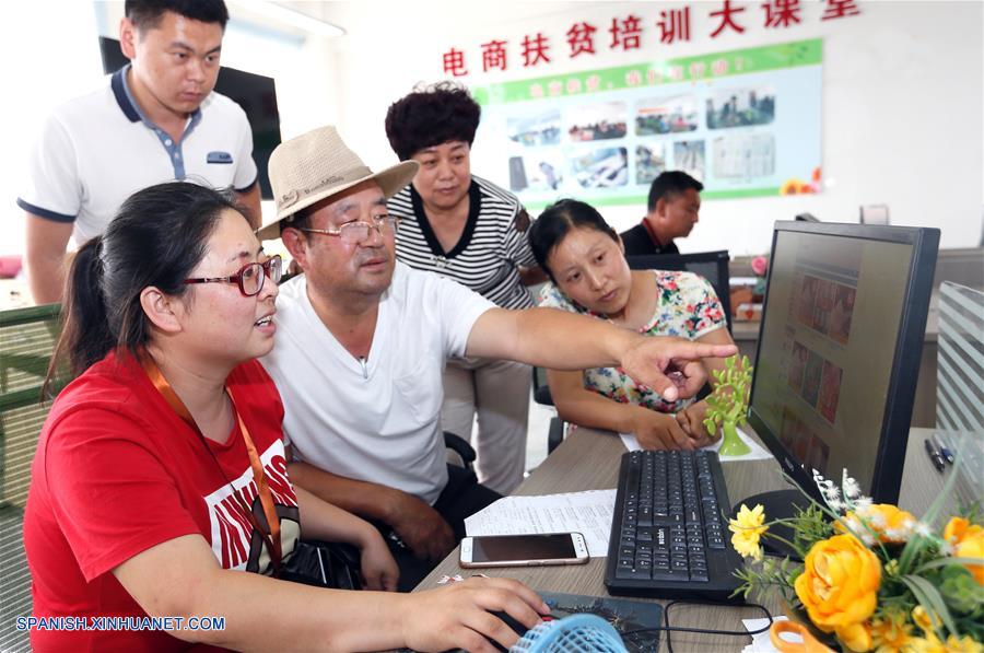 SHANDONG, julio 5, 2018 (Xinhua) -- El técnico, Yuan Liqin (frente), da instrucciones a los agricultores acerca de la venta de productos en una plataforma en línea, en la localidad de Yifengdian del distrito de Jimo de la ciudad de Qingdao, provincia de Shandong, en el este de China, el 5 de julio de 2018. Equipos de técnicos fueron creados en el distrito de Jimo para proporcionar consultas a familias afectadas por la pobreza, quienes enfrentan problemas cuando llevan a cabo proyectos personalizados de mitigación de la pobreza. Aproximadamente 700 familias han obtenido ayuda e incrementado sus ingresos. (Xinhua/Liang Xiaopeng)