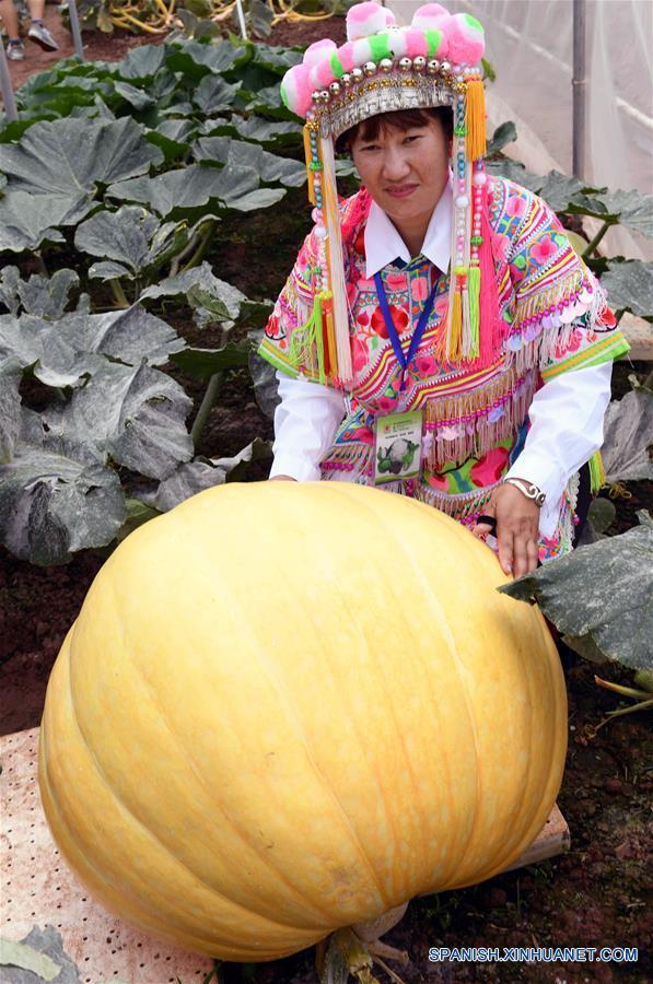 Una mujer posa con una calabaza gigante durante la Exposición de Semillas y Vegetales de Yunnan 2018, en el condado de Wuding, en la Prefectura Autónoma Chuxiong Yi, provincia de Yunnan, en el suroeste de China, el 9 de julio de 2018. (Xinhua/Yang Zongyou)