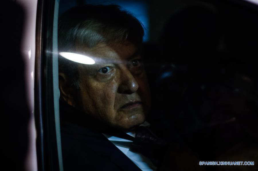 El virtual ganador de la elección presidencial en México, Andrés Manuel López Obrador, reacciona en su coche después de reunirse con empresarios e industriales de la Confederación de Cámaras Industriales (CONCAMIN), en la Ciudad de México, capital de México, el 9 de julio de 2018. De acuerdo con información de la prensa local, Andrés Manuel López Obrador se reunió el lunes a puerta cerrada en un hotel de Polanco con empresarios e industriales de la CONCAMIN para tratar temas de inversión. (Xinhua/Francisco Ca?edo)
