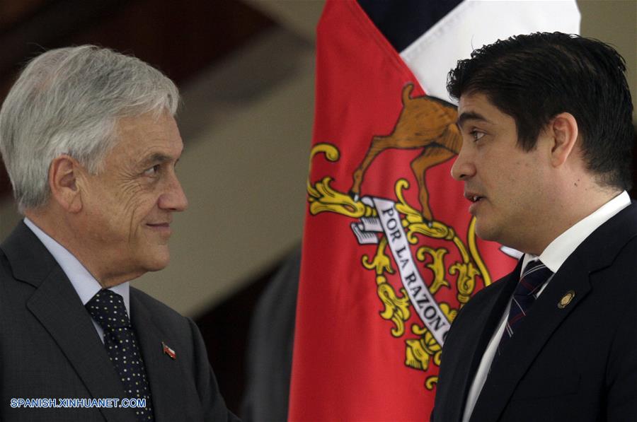 El presidente costarricense, Carlos Alvarado (d), y su homólogo de Chile, Sebastián Pi?era (i), conversan luego de la ceremonia de firma de acuerdos bilaterales, en la Casa Presidencial, en San José, capital de Costa Rica, el 9 de julio de 2018. Costa Rica y Chile firmaron el lunes varios acuerdos de cooperación y dos memorandos de entendimiento sobre protección al medio ambiente y la promoción de la igualdad de género, informó la cancillería costarricense. (Xinhua/Kent Gilbert)