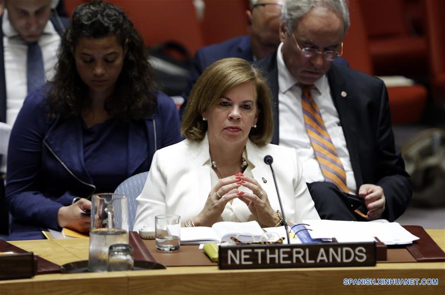 Evelyn Wever-Croes (frente), primera ministra de Aruba, país autónomo del Reino de los Países Bajos, asiste a una reunión del Consejo de Seguridad de la Organización de las Naciones Unidas (ONU) sobre ni?os y conflictos armados, en la sede de la ONU en Nueva York, Estados Unidos, el 9 de julio de 2018. El Consejo de Seguridad de la ONU adoptó el lunes una resolución encaminada a establecer un marco para la protección, los derechos, el bienestar y el empoderamiento de los ni?os durante un conflicto. (Xinhua/Li Muzi)