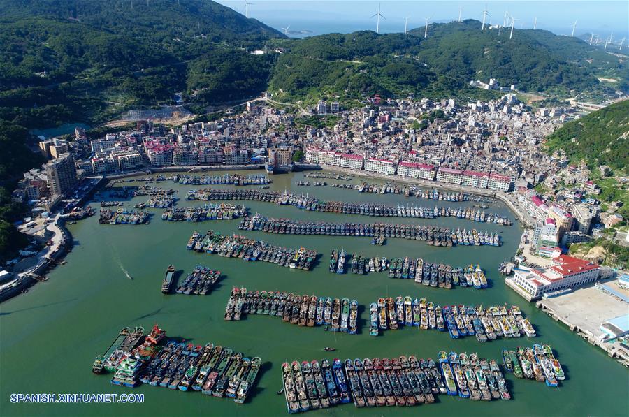 Vista aérea de botes pesqueros permaneciendo atracados en un muelle mientras el tifón María, el octavo tifón del a?o, se aproxima a las costas chinas, en el condado de Lianjiang, provincia de Fujian, en el sureste de China, el 10 de julio de 2018. (Xinhua/Jiang Kehong)