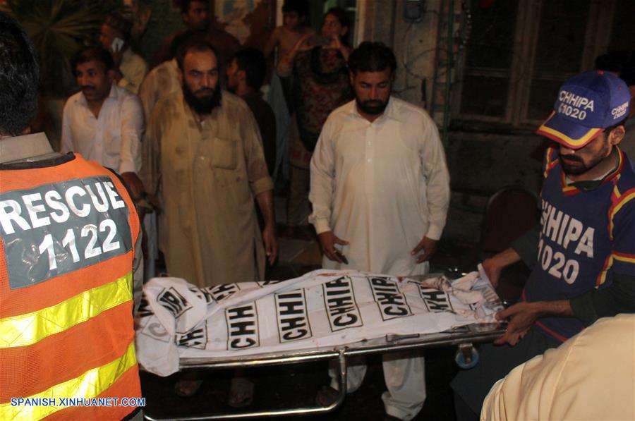 Rescatistas trasladan un cuerpo del sitio de una explosión en Peshawar, en el noroeste de Pakistán, el 10 de julio de 2018.(Xinhua/Saeed Ahmad)