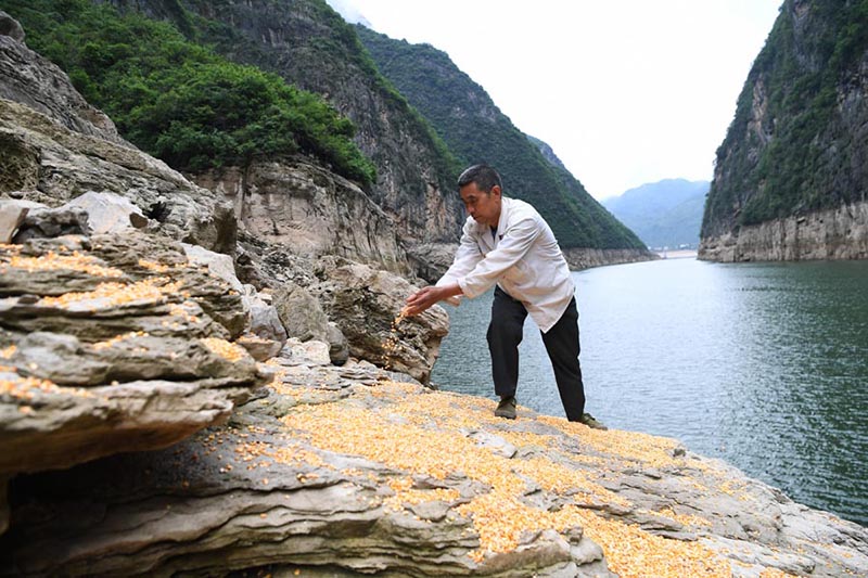 Dai Guangqun esparce maíz en una formación rocosa a lo largo del río Daning, un afluente del río Yangtze, en el condado Wushan en Chongqing. [Foto / Xinhua]