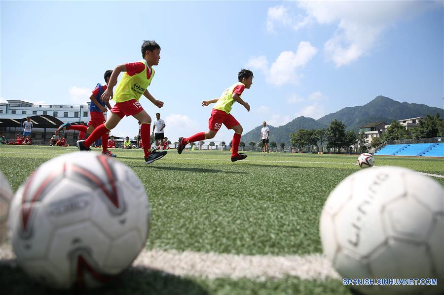 DANZHAI, julio 11, 2018 (Xinhua) -- Jóvenes jugadores reciben entrenamiento durante un campamento de verano de fútbol en el patio de una escuela primaria, en el condado de Danzhai, provincia de Guizhou, en el suroeste de China, el 11 de julio de 2018. (Xinhua/Huang Xiaohai)