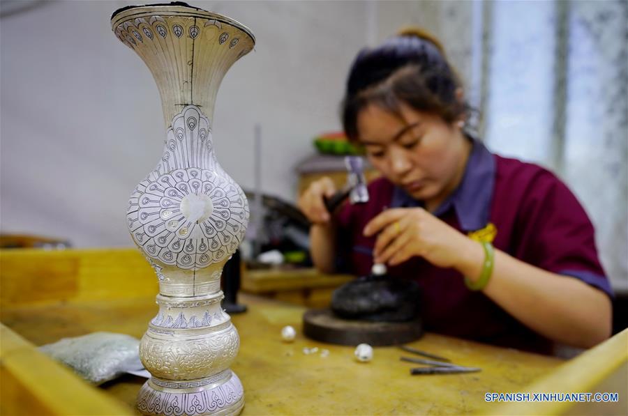HEBEI, julio 11, 2018 (Xinhua) -- Una trabajadora elabora platería en un taller, en el municipio de Malanyu en la ciudad de Zunhua, provincia de Hebei, en el norte de China, el 11 de julio de 2018. El procesamiento del oro y la plata en el municipio de Malanyu tiene una larga historia y la industria se está expandiendo a medida que los artesanos combinan elementos modernos con las técnicas tradicionales en a?os recientes. Hasta la fecha, hay más de 80 empresas que proporcionan más de 2,000 empleos a los residentes. (Xinhua/Mu Yu)