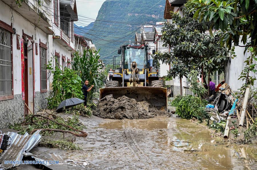SICHUAN, julio 12, 2018 (Xinhua) -- Personas retiran el barro de una calle, en la localidad de Chenjiaba del condado de Beichuan, provincia de Sichuan, en el suroeste de China, el 12 de julio de 2018. Los torrenciales duraderos de los últimos días han causado severas inundaciones en los condados de Santai, Beichuan y Pingwu en Sichuan. 595 personas que estaban varadas por la inundación en la villa de Laochang de la localidad de Chenjiaba han sido evacuadas. (Xinhua/Zhang Chaoqun)