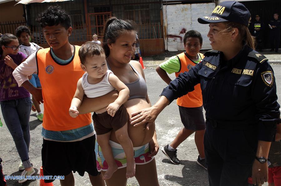 SAN JOSE, julio 13, 2018 (Xinhua) -- La oficial de policía, Karla Donato (d), conversa con una joven embarazada mientras ni?os juegan fútbol con oficiales de la policía durante las vacaciones de verano, en San José, Costa Rica, el 13 de julio de 2018. De acuerdo con información de la prensa local, "La Mejenga", una iniciativa que propone organizar partidos de fútbol en comunidades necesitadas, fue creada por el Ministerio de Seguridad Pública de Costa Rica en convenio con la Federación Costarricense de Fútbol con el objetivo de recuperar las zonas tomadas por bandas criminales y generar espacios más seguros y saludables para los ciudadanos, así como para crear una oportunidad para advertir a los ni?os y jóvenes sobre los peligros de las drogas, la violencia y el crimen. (Xinhua/Kent Gilbert)