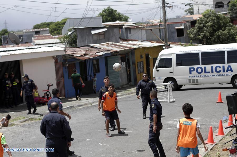 SAN JOSE, julio 13, 2018 (Xinhua) -- Ni?os juegan fútbol con oficiales de la policía durante las vacaciones de verano, en San José, Costa Rica, el 13 de julio de 2018. De acuerdo con información de la prensa local, "La Mejenga", una iniciativa que propone organizar partidos de fútbol en comunidades necesitadas, fue creada por el Ministerio de Seguridad Pública de Costa Rica en convenio con la Federación Costarricense de Fútbol con el objetivo de recuperar las zonas tomadas por bandas criminales y generar espacios más seguros y saludables para los ciudadanos, así como para crear una oportunidad para advertir a los ni?os y jóvenes sobre los peligros de las drogas, la violencia y el crimen. (Xinhua/Kent Gilbert)