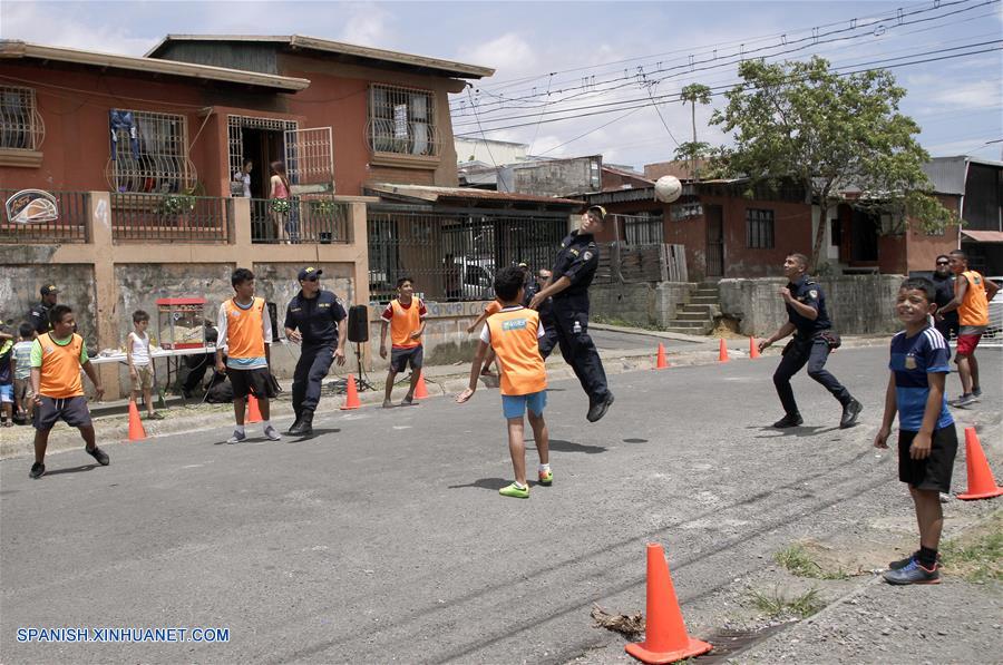 SAN JOSE, julio 13, 2018 (Xinhua) -- Ni?os juegan fútbol con oficiales de la policía durante las vacaciones de verano, en San José, Costa Rica, el 13 de julio de 2018. De acuerdo con información de la prensa local, "La Mejenga", una iniciativa que propone organizar partidos de fútbol en comunidades necesitadas, fue creada por el Ministerio de Seguridad Pública de Costa Rica en convenio con la Federación Costarricense de Fútbol con el objetivo de recuperar las zonas tomadas por bandas criminales y generar espacios más seguros y saludables para los ciudadanos, así como para crear una oportunidad para advertir a los ni?os y jóvenes sobre los peligros de las drogas, la violencia y el crimen. (Xinhua/Kent Gilbert)