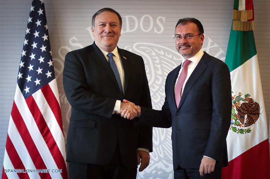 CIUDAD DE MEXICO, julio 13, 2018 (Xinhua) -- El secretario de Relaciones Exteriores mexicano, Luis Videgaray (d), estrecha la mano con el secretario de Estado de Estados Unidos, Mike Pompeo (i), al término de su reunión en la Ciudad de México, capital de México, el 13 de julio de 2018. De acuerdo con información de la prensa local, durante la reunión entre Pompeo y Videgaray, llevada a cabo en la sede de la Secretaría de Relaciones Exteriores, los funcionarios abordaron temas de migración, seguridad y comercio. (Xinhua/Francisco Ca?edo)
