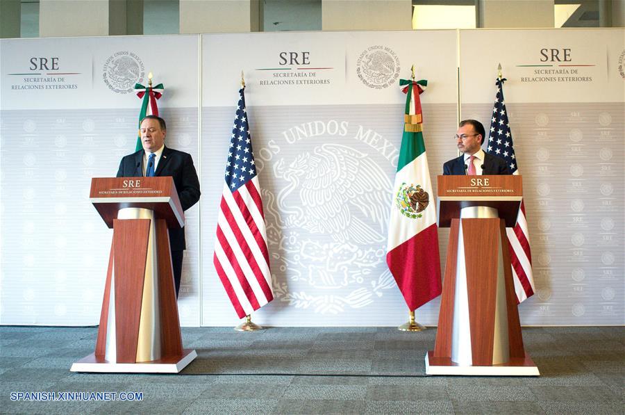 CIUDAD DE MEXICO, julio 13, 2018 (Xinhua) -- El secretario de Relaciones Exteriores mexicano, Luis Videgaray (d), y el secretario de Estado de Estados Unidos, Mike Pompeo (i), participan en una conferencia de prensa al término de su reunión, en la Ciudad de México, capital de México, el 13 de julio de 2018. De acuerdo con información de la prensa local, durante la reunión entre Pompeo y Videgaray, llevada a cabo en la sede de la Secretaría de Relaciones Exteriores, los funcionarios abordaron temas de migración, seguridad y comercio. (Xinhua/Francisco Ca?edo)