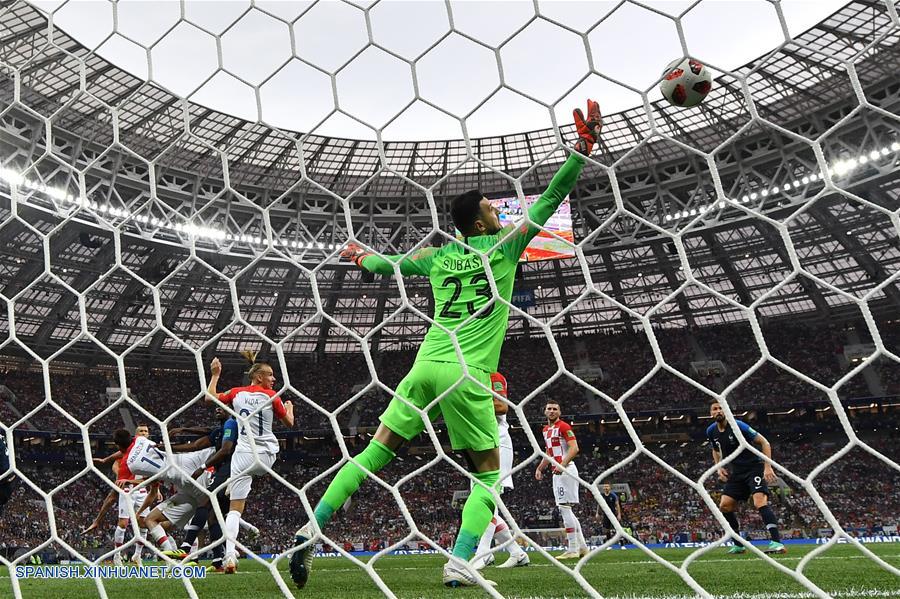 MOSCU, julio 15, 2018 (Xinhua) -- El guardameta Danijel Subasic (frente), de Croacia, falla al atajar el balón durante el partido de la final de la Copa Mundial de la FIFA Rusia 2018, ante Francia, en Moscú, Rusia, el 15 de julio de 2018. (Xinhua/Liu Dawei)