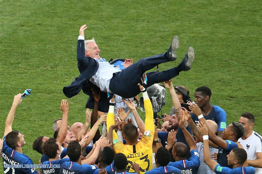 MOSCU, julio 15, 2018 (Xinhua) -- Jugadores de Francia lanzan al aire a su director técnico Didier Deschamps (arriba) al término del partido de la final de la Copa Mundial de la FIFA Rusia 2018, ante Croacia, en Moscú, Rusia, el 15 de julio de 2018. (Xinhua/Li Ming)