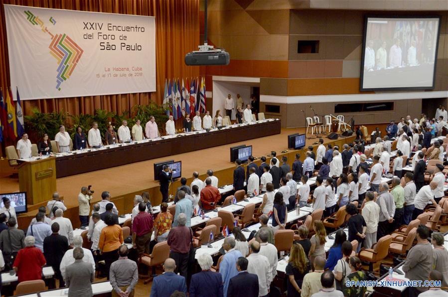Personas asisten a la XXIV reunión del Foro de Sao Paulo, en La Habana, capital de Cuba, el 15 de julio de 2018. Más de un centenar de partidos políticos y movimientos sociales de América Latina se darán cita desde el domingo en La Habana para participar en la XXIV reunión del Foro de Sao Paulo, un espacio de concertación de la izquierda del continente. (Xinhua/Joaquín Hernández)
