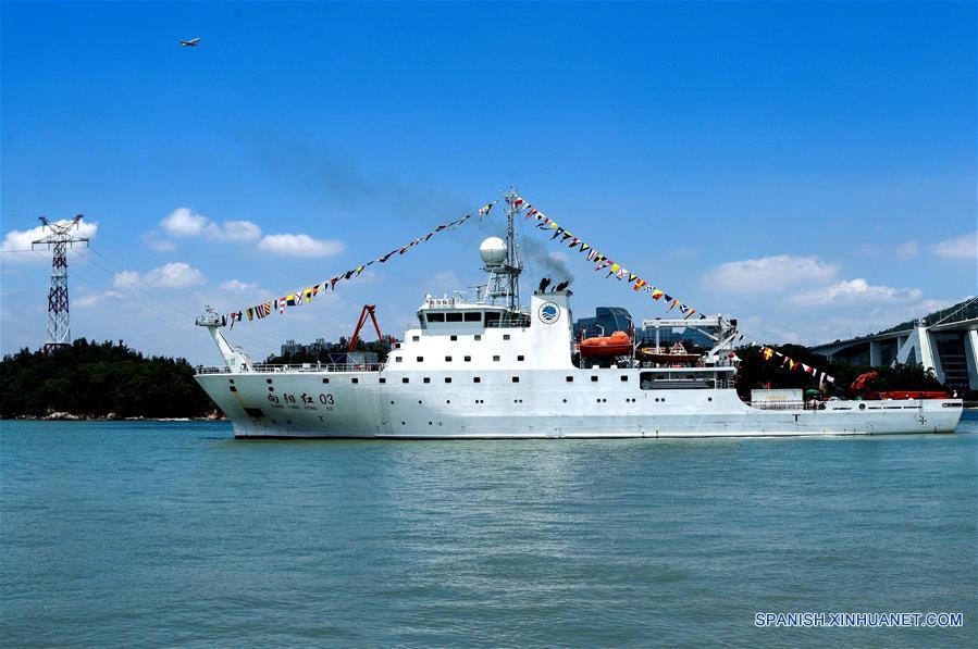 El barco de investigación oceanográfica chino, Xiangyanghong 03, sale de Xiamen, provincia de Fujian, en el sureste de China, el 14 de julio de 2018. El barco de investigación oceanográfica chino, Xiangyanghong 03, partió el sábado para iniciar la 50 expedición de investigación oceánica del país en el oeste y este del Océano Pacífico. El barco salió de Xiamen, provincia de Fujian, este de China, con 160 personas a bordo para una misión de 150 días de más de 15,000 millas náuticas. (Xinhua/Str)