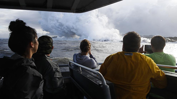 Varias personas observan la erupción del volcán Kilauea desde un barco (AP)