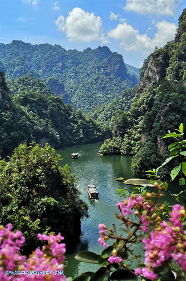 HUNAN, julio 16, 2018 (Xinhua) -- Turistas realizan una excursión en bote en un punto escénico de Zhangjiajie, provincia de Hunan, en el centro de China, el 16 de julio de 2018. (Xinhua/Wu Yongbing)