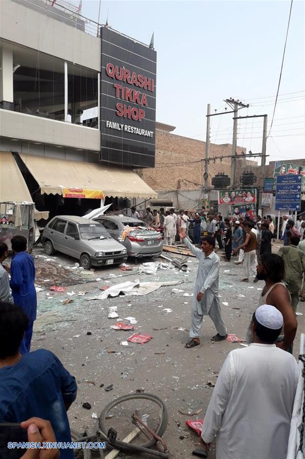 Personas se reúnen en el sitio de una explosión, en Multan, en el centro de Pakistán, el 16 de julio de 2018. Una explosión en un restaurante provocó el lunes por lo menos tres muertes y lesiones a 25 personas en el distrito central de Multan, en Pakistán, informó la prensa local. (Xinhua/Str)