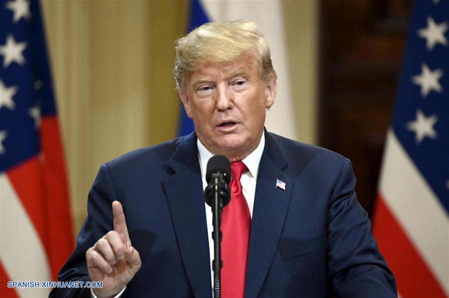 El presidente de Estados Unidos, Donald Trump, pronuncia un discurso durante una conferencia de prensa conjunta con el presidente de Rusia, Vladimir Putin, en Helsinki, Finlandia, el 16 de julio de 2018. (Xinhua/Lehtikuva/Antti Aimo-Koivisto)