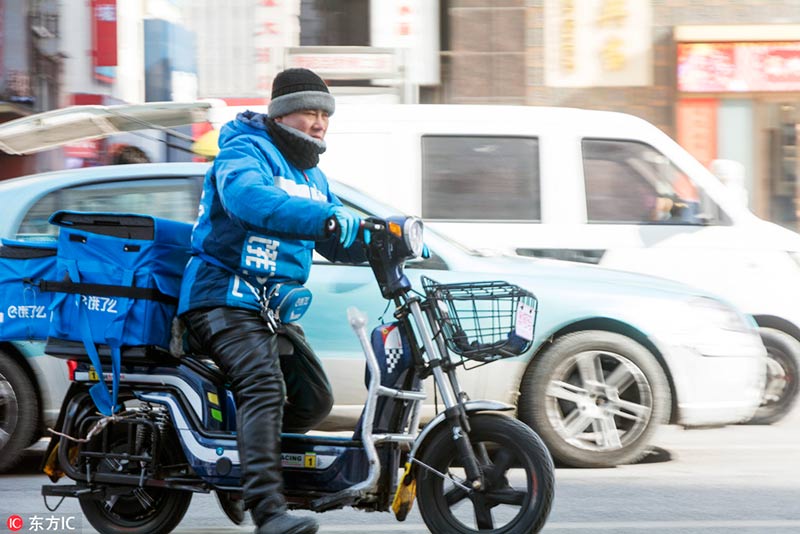 Un repartidor de comida entrega un pedido en Dalian, provincia de Liaoning, noreste de China, el 3 de febrero de 2018. [Foto / IC]