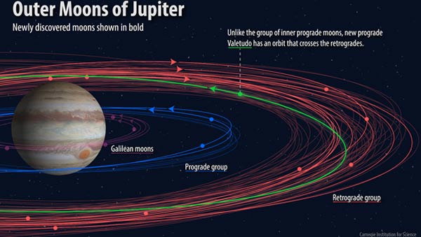 Los grupos de lunas jovianas con las recién descubiertas. El ?bicho raro?, llamado Valetudo, tiene una órbita prógrada que cruza las órbitas retrógradas - Carnegie Institution for Science