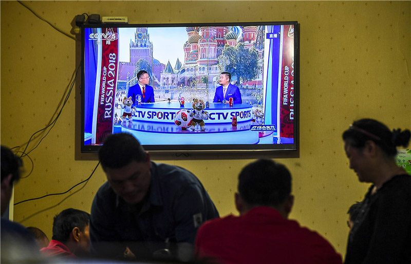 Los clientes cenan mientras miran un partido de la Copa del Mundo en el restaurante de Li. [Xinhua / Hu Huhu]
