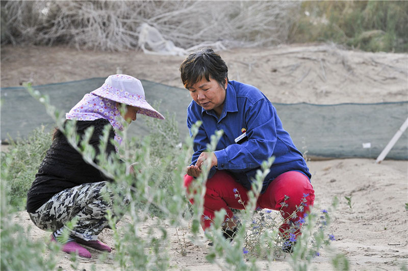Chang Qing (derecha) revisa la planta en el jardín botánico. [Xinhua / Hu Huhu]