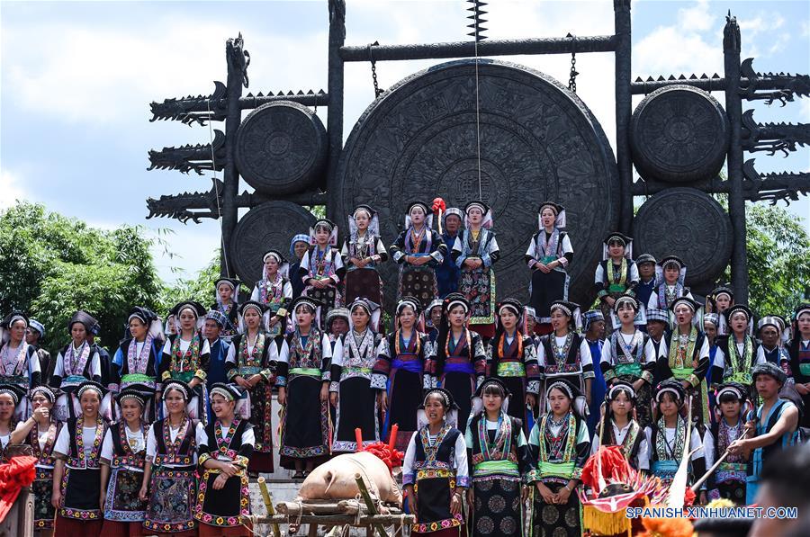 Personas del grupo étnico Bouyei celebran el Festival Doble Sexto, en Liuzhi, provincia de Guizhou, en el suroeste de China, el 18 de julio de 2018. El Festival Doble Sexto, un importante festival tradicional para el pueblo Bouyei, se celebra el sexto día del sexto mes de acuerdo con el calendario lunar, cuando las personas hacen ofrendas a los dioses, cantan y danzan portando vestidos tradicionales. (Xinhua/Tao Liang)