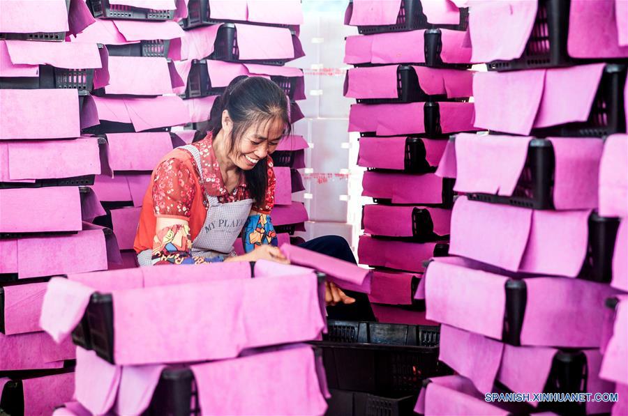Una granjera empaqueta jitomates cherry en el condado de Dafang de Bijie, en la provincia de Guizhou, en el suroeste de China, el 18 de julio de 2018. Los granjeros en el condado de Bijie se encuentran ocupados recolectando jitomates cherry durante la temporada de cosecha. (Xinhua/Luo Dafu)