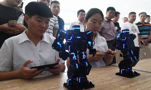 Los estudiantes posicionan los robots antes de un partido de fútbol organizado por las escuelas profesionales superiores en Beijing, el 18 de julio de 2018. Alrededor de 200 estudiantes de 30 escuelas profesionales superiores participaron en el partido. (Xinhua / Li Xin)