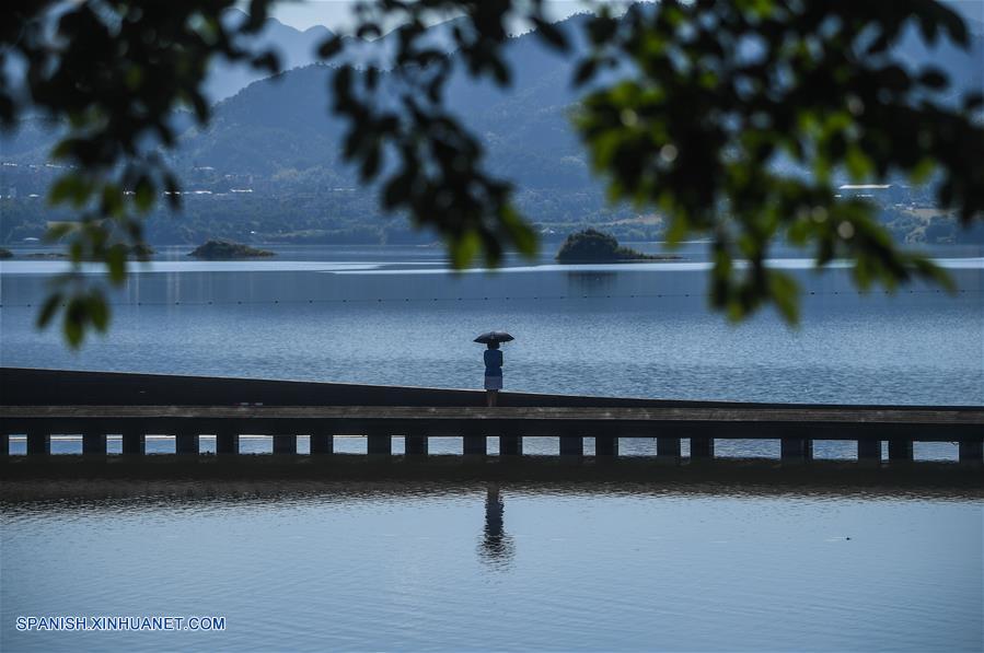 Una turista observa el paisaje del lago Qiandao en la plaza Perla, en el condado de Chun'an, provincia de Zhejiang, en el este de China, el 18 de julio de 2018. La zona de desarrollo económico de Chun'an se localiza en la orilla del lago Qiandao, un parque forestal nacional y destino turístico de nivel 5A de China. En los últimos 25 a?os, el gobierno local ha impulsado el turismo ecológico y la protección del medio ambiente en la zona, que se centran en la gestión fluvial, la protección de las fuentes de agua potable y el dise?o del paisaje. (Xinhua/Xu Yu)