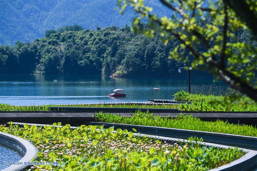 Vista aérea de un paisaje captado a la orilla del lago Qiandao, en el condado de Chun'an, provincia de Zhejiang, en el este de China, el 18 de julio de 2018. La zona de desarrollo económico de Chun'an se localiza en la orilla del lago Qiandao, un parque forestal nacional y destino turístico de nivel 5A de China. En los últimos 25 a?os, el gobierno local ha impulsado el turismo ecológico y la protección del medio ambiente en la zona, que se centran en la gestión fluvial, la protección de las fuentes de agua potable y el dise?o del paisaje. (Xinhua/Xu Yu)