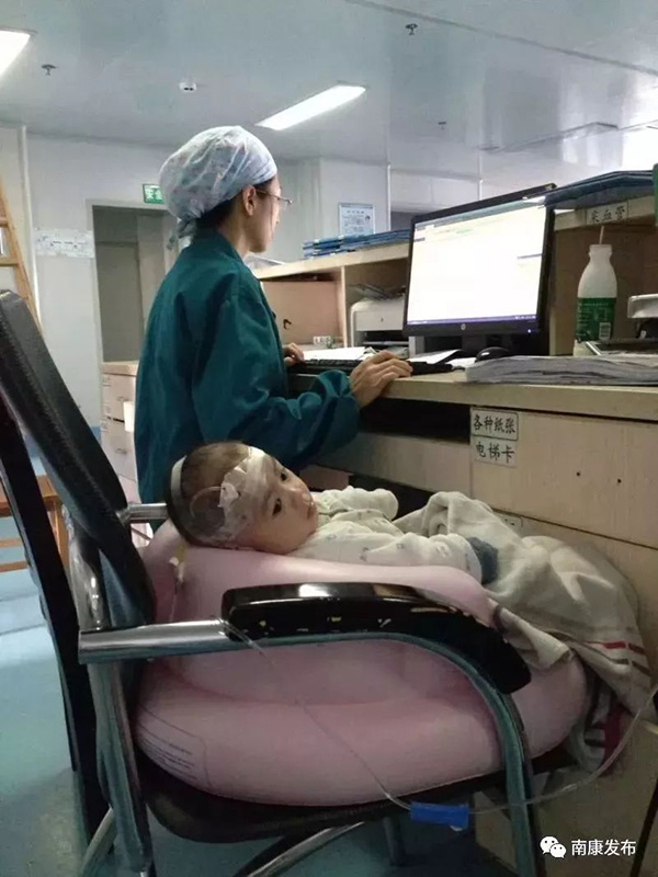 Un médico trabaja y cuida a Duoduo. [Foto: cuenta de WeChat]