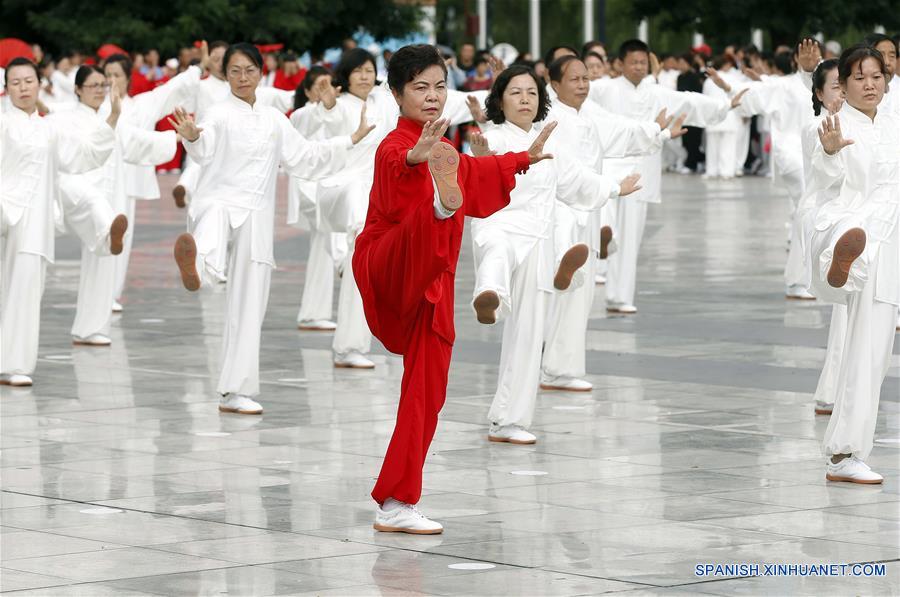 Aficionados de Taiji (boxeo chino con un adversario imaginario) realizan una actuacón en la antigua localidad de Kongtong en la ciudad de Pingliang, provincia de Gansu, en el noroeste de China, el 21 de julio de 2018. Más de 100,000 aficionados del Taiji participaron en el espectáculo durante la ceremonia de inauguración de un festival de turismo llevado a cabo el sábado en la ciudad de Pingliang. (Xinhua/Yang Xin)
