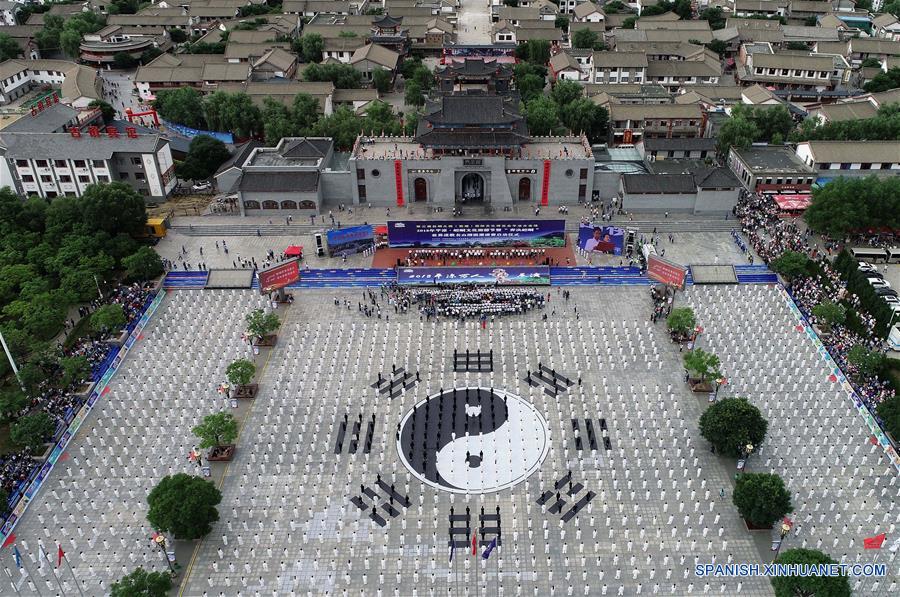 GANSU, julio 21, 2018 (Xinhua) -- Vista aérea del espectáculo de Taiji (boxeo chino con un adversario imaginario), en la antigua localidad de Kongtong en la ciudad de Pingliang, provincia de Gansu, en el noroeste de China, el 21 de julio de 2018. Más de 100,000 aficionados del Taiji participaron en el espectáculo durante la ceremonia de inauguración de un festival de turismo llevado a cabo el sábado en la ciudad de Pingliang. (Xinhua/Yang Xin)