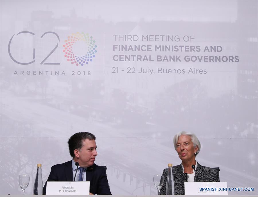 El ministro de Hacienda y Finanzas de Argentina, Nicolás Dujovne (i), y la directora gerente del Fondo Monetario Internacional (FMI), Christine Lagarde (d), participan en una conferencia de prensa en el marco de la tercera Reunión de ministros de Finanzas y presidentes de Bancos Centrales del Grupo de los 20 (G20), en el Centro de Exposiciones y Convenciones (CEC) de la ciudad de Buenos Aires, capital de Argentina, el 21 de julio de 2018. Al menos 57 representantes, entre ministros de Finanzas y presidentes de Bancos Centrales de los países que integran el G20, se dan cita en el Centro de Exposiciones y Convenciones (CEC) de Buenos Aires, para llevar a cabo su tercera reunión de cara a la Cumbre de jefes de Estado del G20 del 30 de noviembre y 1 de diciembre próximos. El encuentro cuenta con la participación de 23 ministros de Finanzas, 14 presidentes de Bancos Centrales, 10 titulares de organizaciones internacionales y otros representantes. (Xinhua/Str)